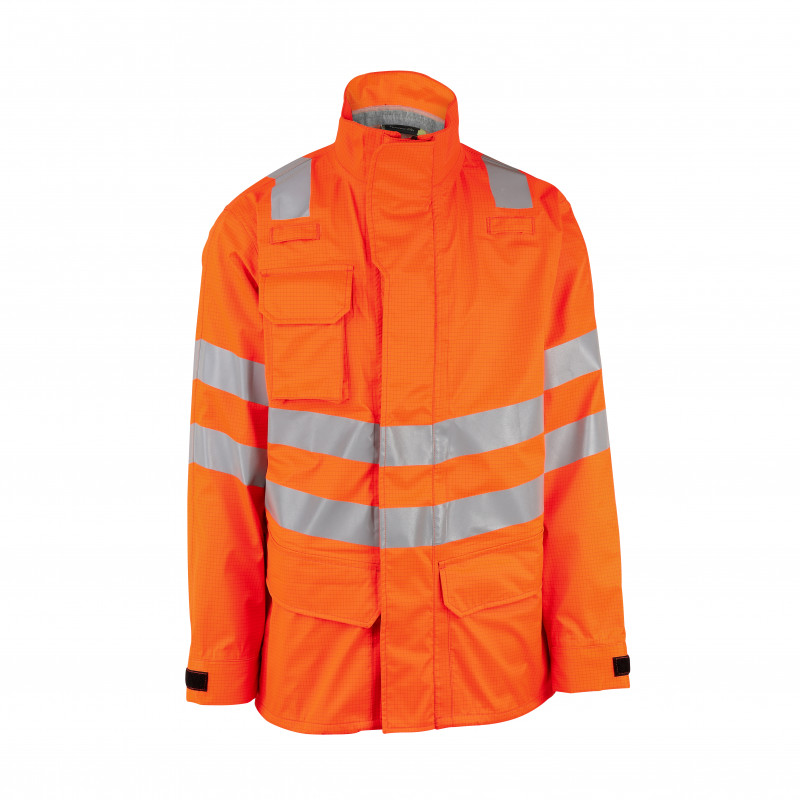 ProGARM 9140 Hi-Vis Orange Waterproof Jacket delivers advanced arc flash protection for workers in hazardous environments. Made from ProGARM VXS+ FR inherent woven fabric (250gsm), this jacket offers ARC 2 protection (ATPV 11 cal/cm², ELIM 9.3 cal/cm²), flame resistance, and compliance with EN ISO 11612, EN 343, EN 1149-5, EN ISO 11611, EN ISO 20471, EN 13034, and EN 61482-2 standards. Features include a mandarin collar for maximum neck protection, adjustable cuffs and waist tabs for a secure fit, internal and external pockets for storage, and studs for attaching an optional waterproof hood. Ideal for rail, petrochemical, industrial electrical, and utility sectors, this jacket ensures safety, durability, and comfort in all weather conditions.